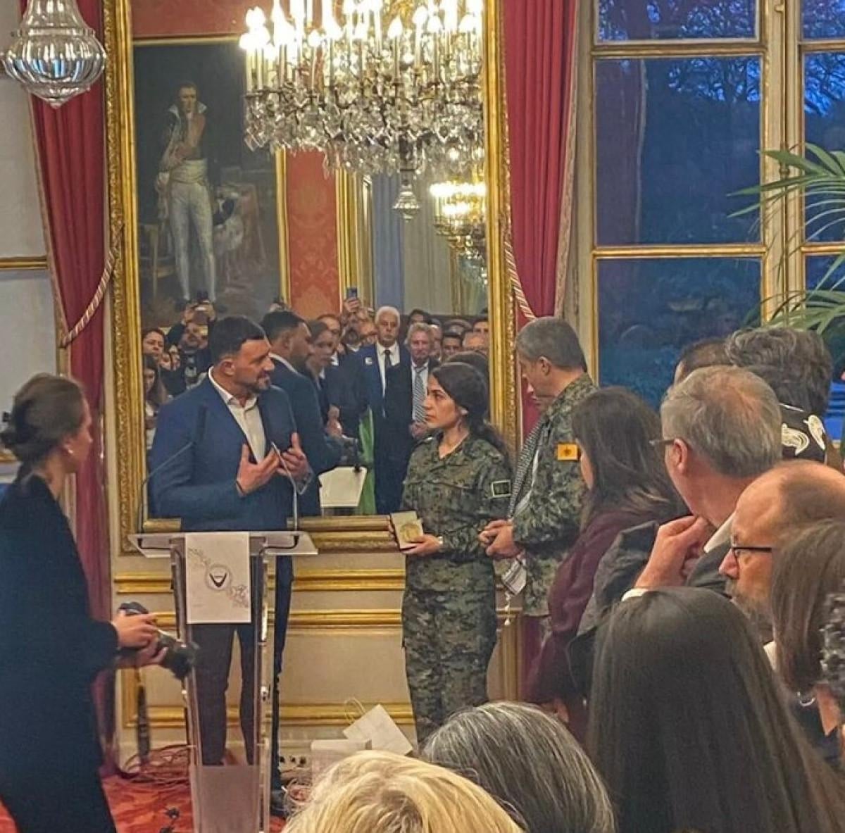 Organize edilen resepsiyonda, YPJ Sözcüsü terörist Ruksan Muhammed ile terör örgütü YPG Sözcüsü Nuri Mehmud'a senato tarafından “Onur Madalyası” verildi.