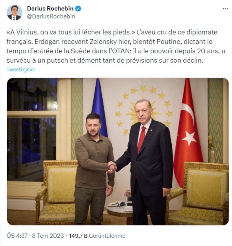 Rochebin, paylaşımında “Bir Fransız diplomat NATO Zirvesi’nde hepimiz Erdoğan'ın ayağını yalıyor olacağız' dedi. Erdoğan 20 yıldır iktidarda. Darbe girişimini atlattı. Düşüşüne dair birçok öngörüyü boşa çıkarıyor.” ifadelerini kullandı.