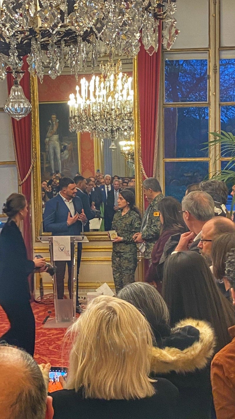 Organize edilen resepsiyonda YPJ Sözcüsü terörist Ruksan Muhammed ile terör örgütü YPG Sözcüsü Nuri Mehmud'a, senato tarafından “Onur Madalyası” verildi.