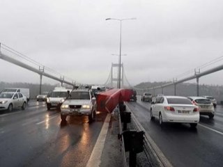 İstanbul'da sabah saatlerinde etkisini artıran şiddetli rüzgar nedeniyle Fatih Sultan Mehmet Köprüsü (FSM) üzerinde, Hasan Akkurt yönetimindeki otomobile bağlı tenteli römork savrularak bariyerlerin üzerine devrildi.
