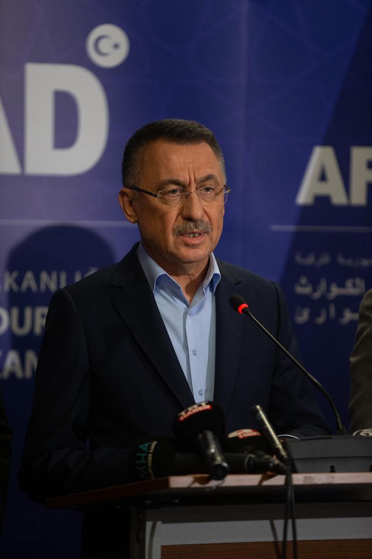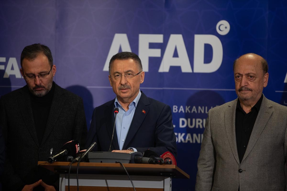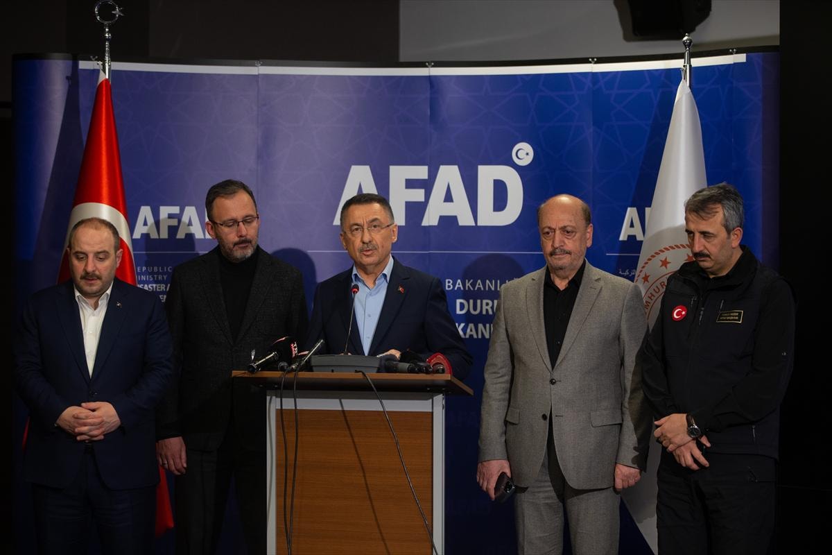 Cumhurbaşkanı Yardımcısı Fuat Oktay, Kahramanmaraş'ta meydana gelen ve 10 ilde yıkıma neden olan 7.7 ve 7.6 büyüklüğündeki depremlere ilişkin Afet ve Acil Durum Yönetimi Başkanlığı'nda (AFAD) basın toplantısı düzenledi.