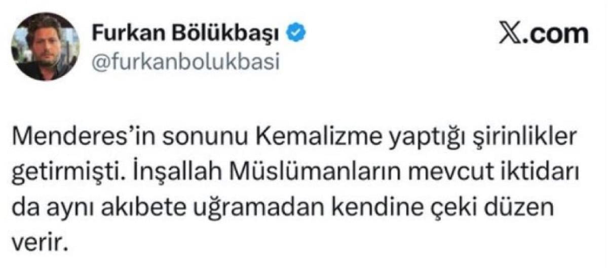37 yaşındaki Bölükbaşı, bir paylaşımında, "Menderes'in sonunu Kemalizme yaptığı şirinlikler getirmişti. İnşallah Müslümanların mevcut iktidarı da aynı akıbete uğramadan kendine çeki düzen verir" ifadelerini kullanmıştı.