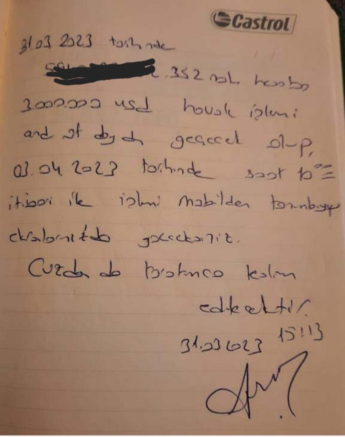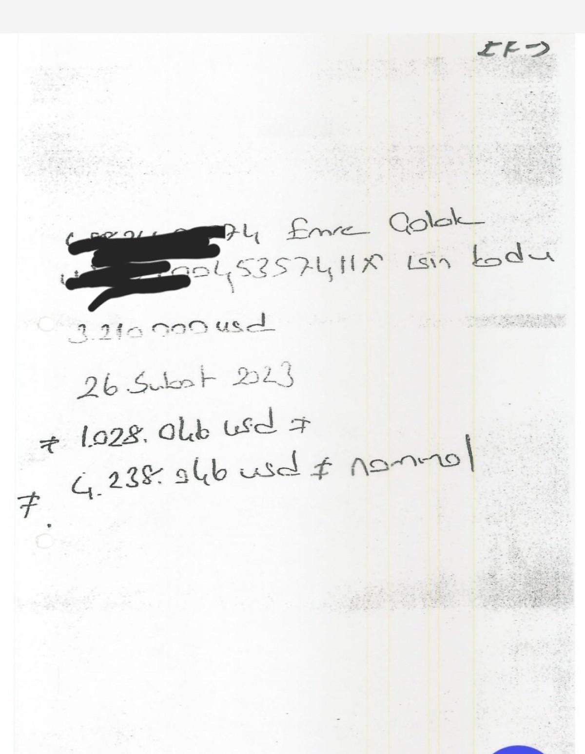 Bankacılık kodları olan kağıtta “3 milyon 210 bin dolar. 26 Şubat 2023. 1 milyon 28 bin dolar. 4 milyon 238 bin dolar nominal” yazıldığı görüldü.