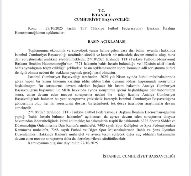 Futbol hakemlerinin bahis oynadığına ilişkin iddialar hakkında açıklama yapan İstanbul Cumhuriyet Başsavcılığı, 2025 bahis oynama iddiası kapsamında başlatılan soruşturmaların devam ettiğini duyurdu.