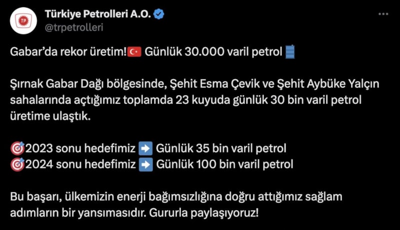 Paylaşımda, "Şırnak Gabar Dağı bölgesinde, Şehit Esma Çevik ve Şehit Aybüke Yalçın sahalarında açtığımız toplam 23 kuyuda günlük 30 bin varil petrol üretime ulaştık. 2023 sonu hedefimiz günlük 35 bin varil petrol, 2024 sonu hedefimiz günlük 100 bin varil petrol. Bu başarı, ülkemizin enerji bağımsızlığına doğru attığımız sağlam adımların bir yansımasıdır. Gururla paylaşıyoruz." denildi.