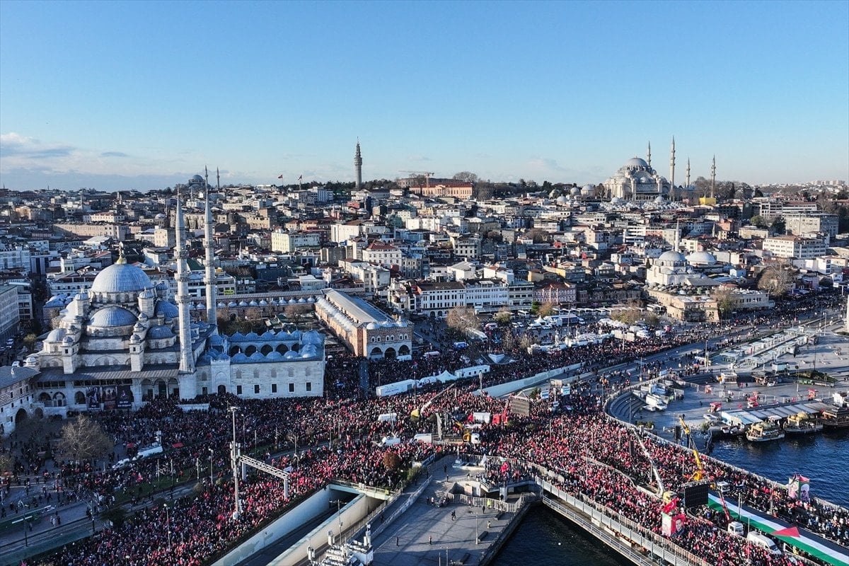 Galata Köprüsü'nden dünyaya Gazze mesajı göndermek için toplanan yüz binler, "Sinmiyoruz, susmuyoruz, Filistin'i unutmuyoruz" sözleriyle haykırdı.