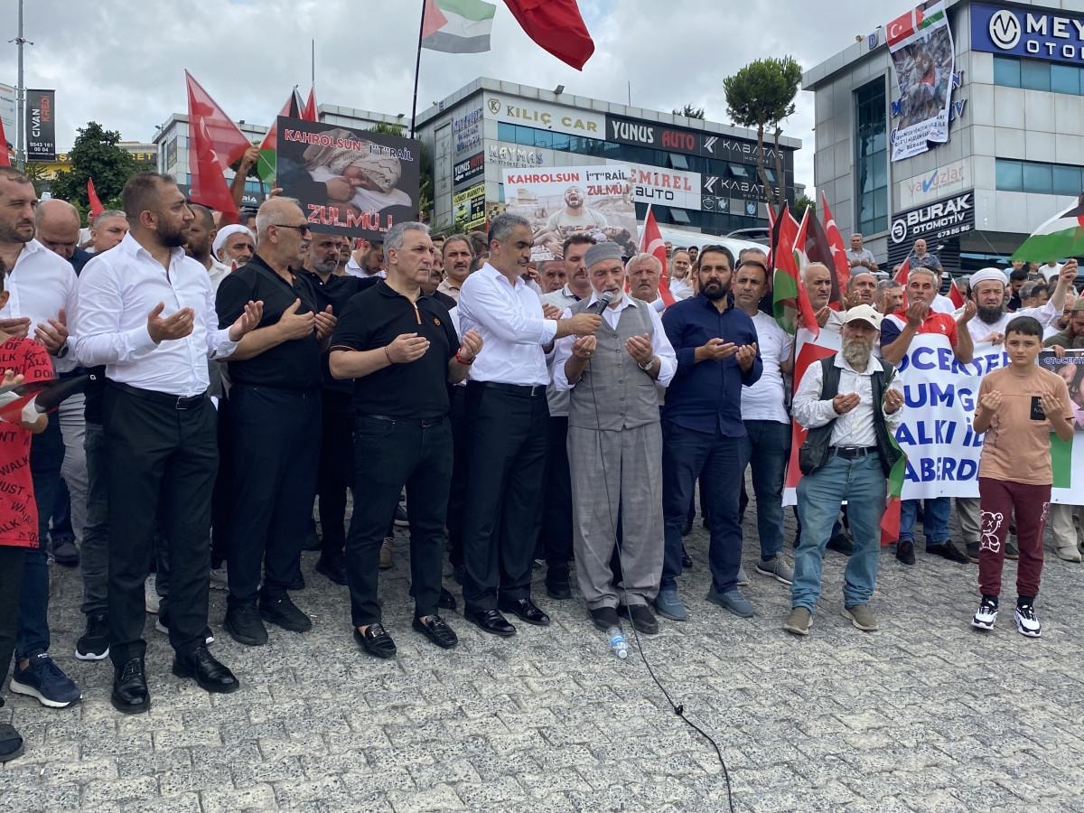 Türk ve Filistin bayraklarıyla çeşitli pankartlar taşıyan grup üyeleri, zaman zaman İsrail aleyhine slogan da attı.
