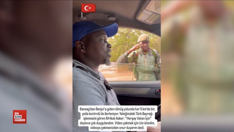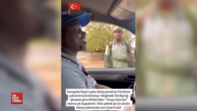 Afrika'ya giden bir Türk'ün, kontrol noktasında karşılaştığı Gambiyalı asker ile gerçekleştirdiği diyalog kısa sürede sosyal medyada gündem oldu. Askerin Türk bayrağı sevgisine beğeni yağarken, söz konusu görüntülere "'Ne işimiz var Afrika'da' sorusunun cevabı" şeklinde yorumlar da yapıldı.