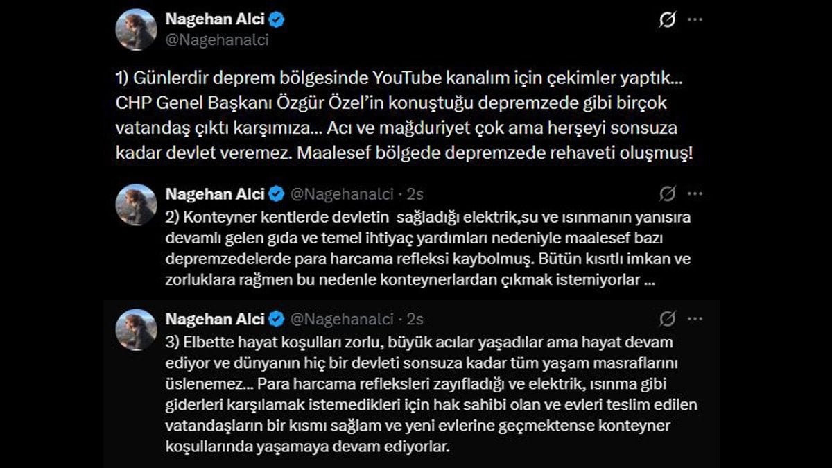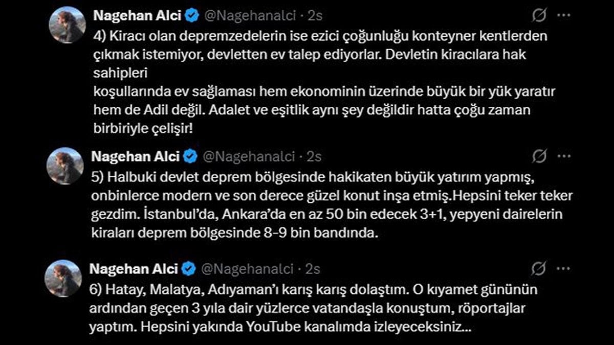 Diğer yandan bir süre deprem bölgesinde bulunan ve kendi Youtube kanalı için çekimler yapan gazeteci Nagehan Alçı da, bölgeye ilişkin izlenimlerini sosyal medya platformu X üzerinden paylaştı.