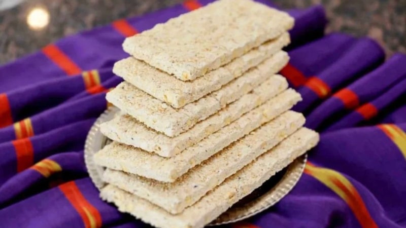 Kısmen sert ve kırılgan yapısıyla öne çıkan ürün, leblebi ve susam taneleriyle zenginleştirilmiş beyaz krem tonlarındaki görünümüyle dikkat çekiyor.