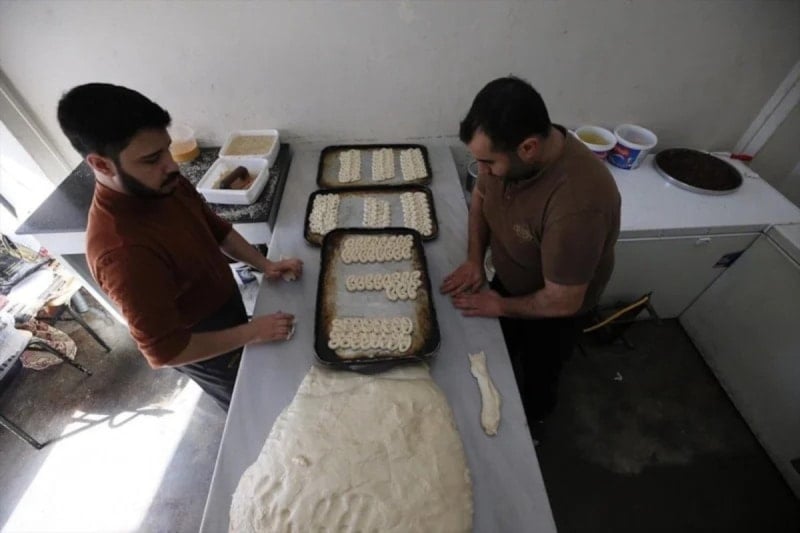 Sabah saat 08.00'de üretime başlayan ustalar, önce hamur kazanında un, şeker, zeytinyağı ve mahlebi karıştırıyor.