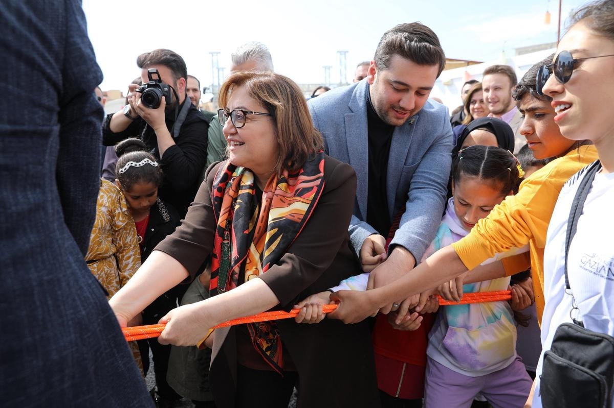 Etkinlik alanını ziyaret eden Gaziantep Büyükşehir Belediye Başkanı Fatma Şahin, eski Adalet Bakanı Abdülhamit Gül ve beraberindeki protokolle depremzede çocukların oyunlarına eşlik ederek halat çekme yarışmasına katıldı.