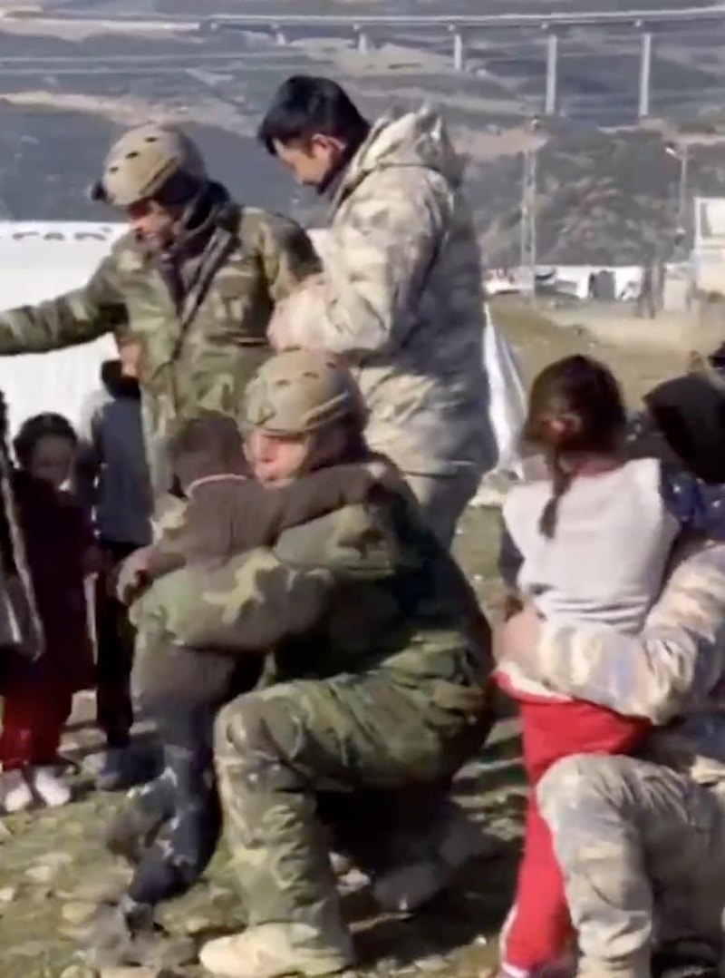 Deprem bölgesinde arama kurtarma çalışmalarına katılan askerler, minik depremzedeleri ziyaret edip çikolata dağıttı. Minikler, karşılarında gördükleri askerleri sevinçle kucakladı.