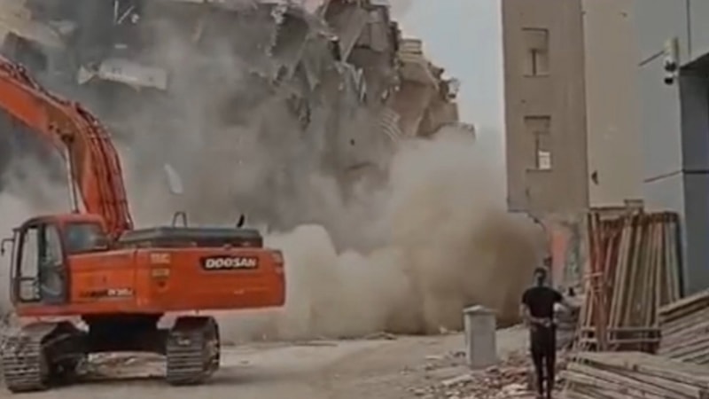 Bina, ekiplerin iş makineleriyle yaptığı çalışma sırasında beklenmedik bir şekilde aniden çöktü.
