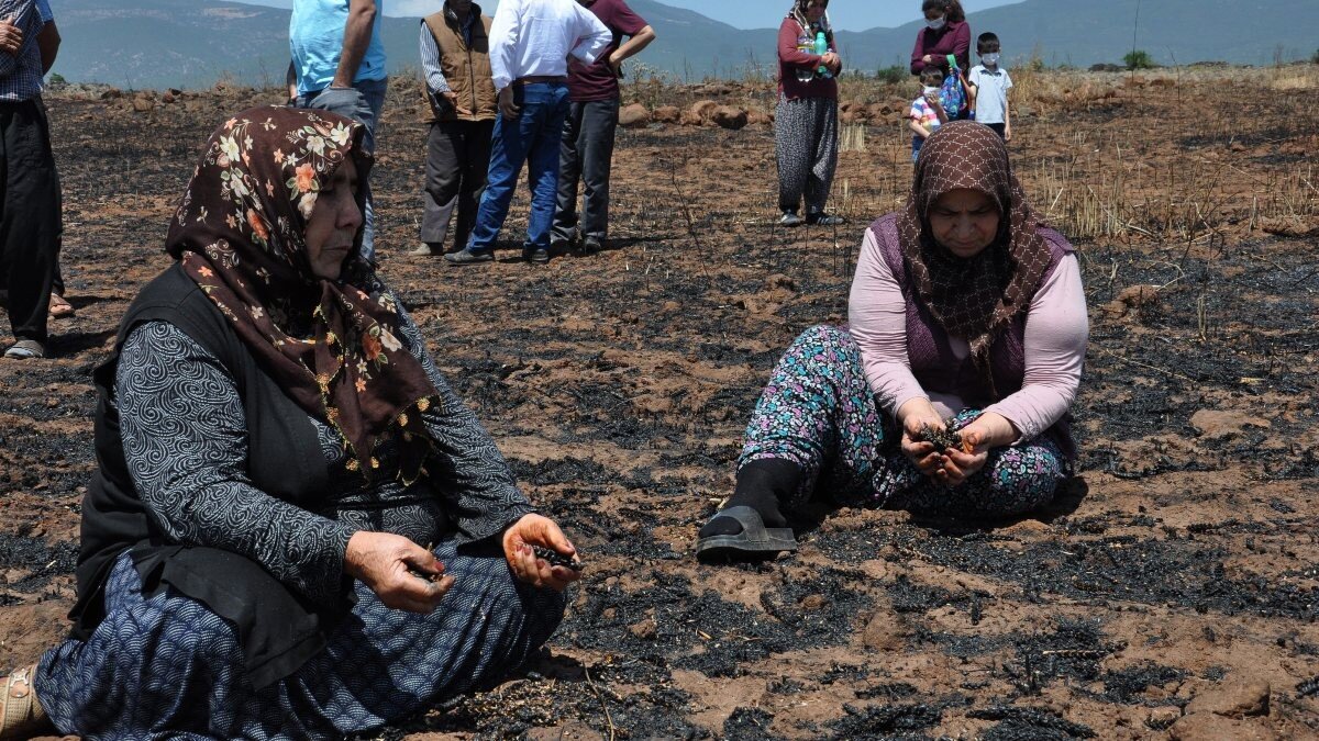 Hasadını yapmayı bekledikleri buğday ekili arazinin yanmasıyla büyük üzüntü yaşayan tarla sahiplerinden Döndü Usluol ve Fadime Usluol, yanmış buğdayları ellerine alarak ağladı.