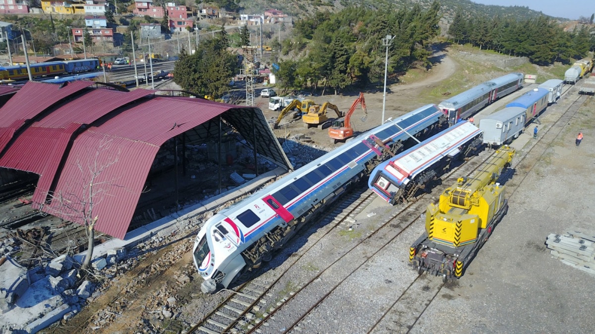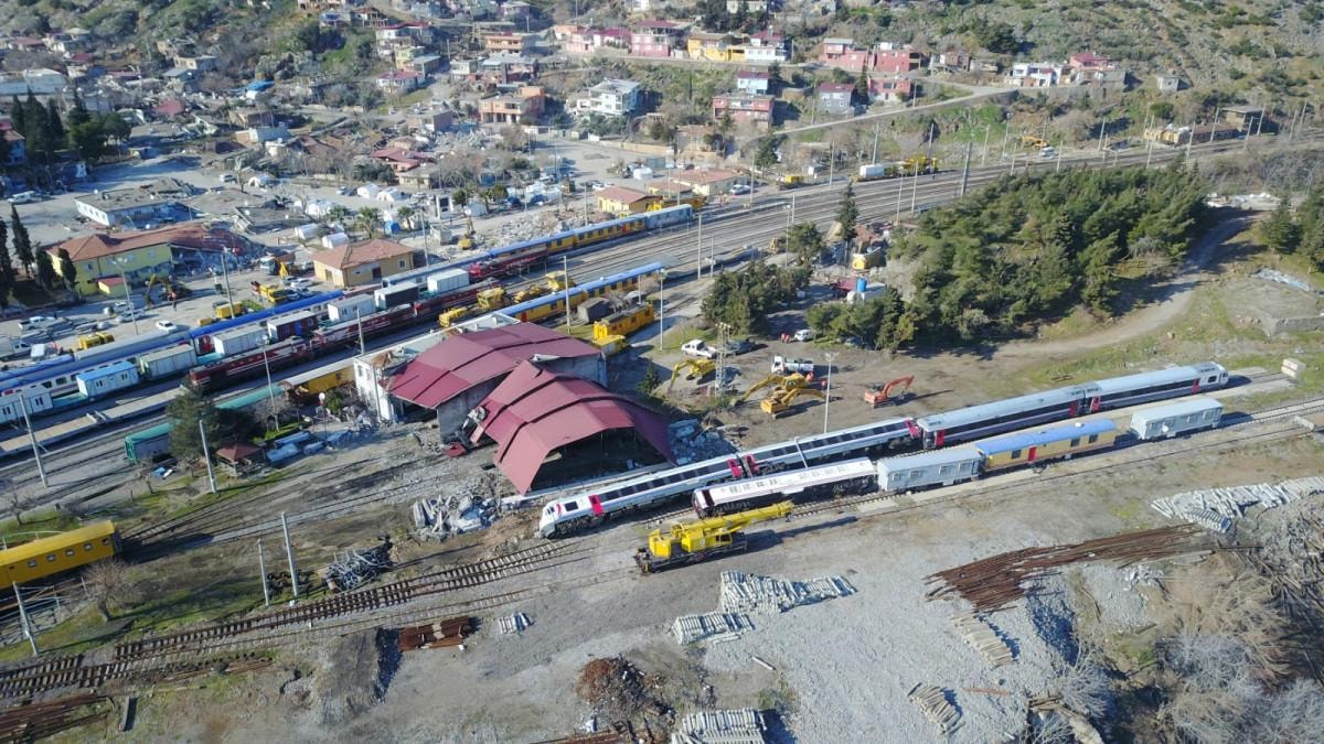 Gaziantep'te depremin şiddetiyle bakım istasyonunda park halinde olan 6 tren raydan çıktı.
