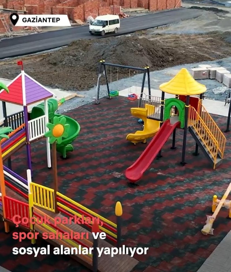Paylaşılan videoda, 123 metrekare alanda bin 280 yapının inşa edildiği bilgisine yer verildi. Çocuk parkları, spor sahaları ve sosyal alanların yapım aşamaları da paylaşıldı.