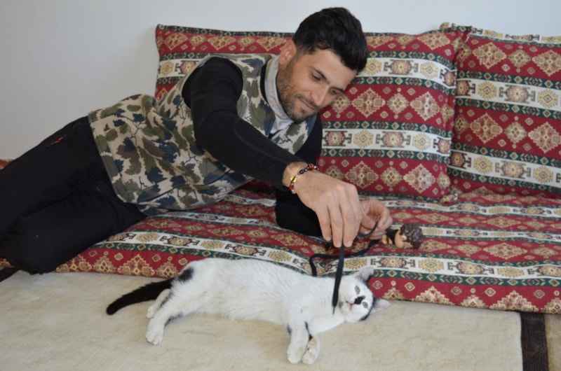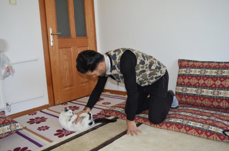 Çakas, Mardin'e getirdiği kediye özenle bakıyor.