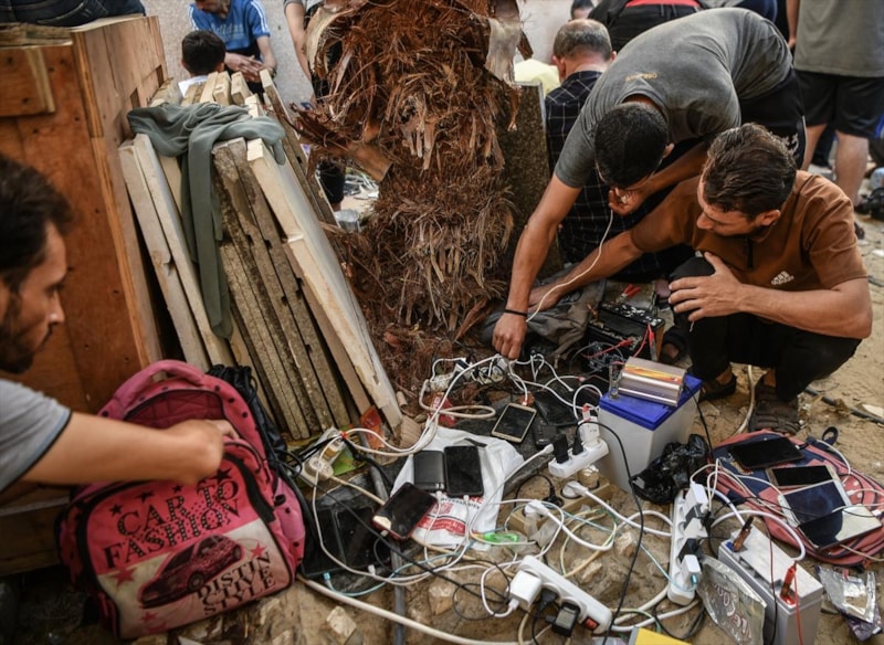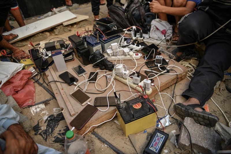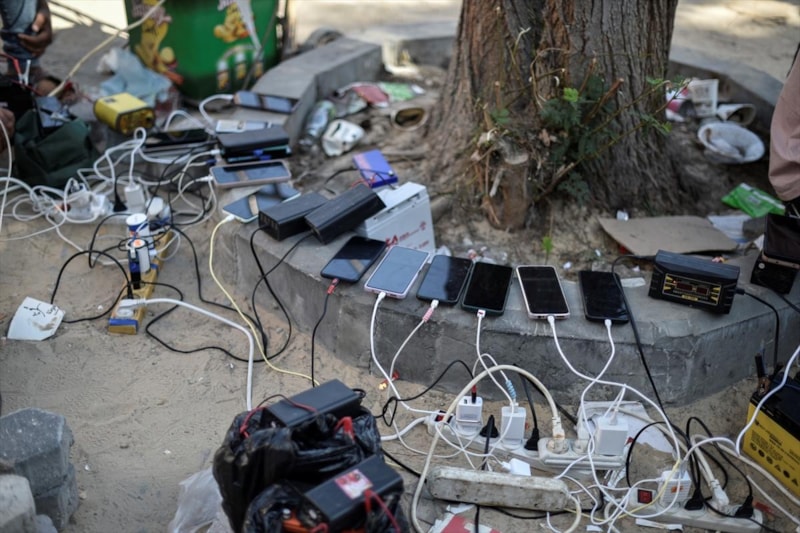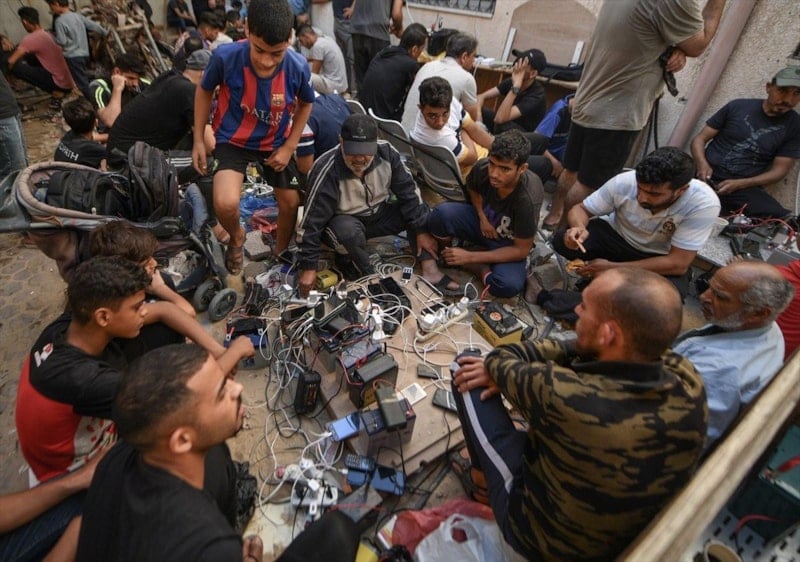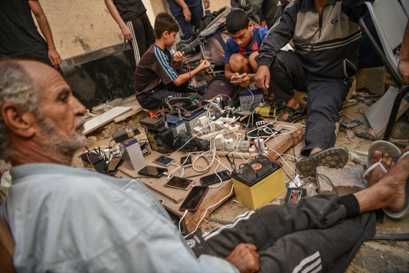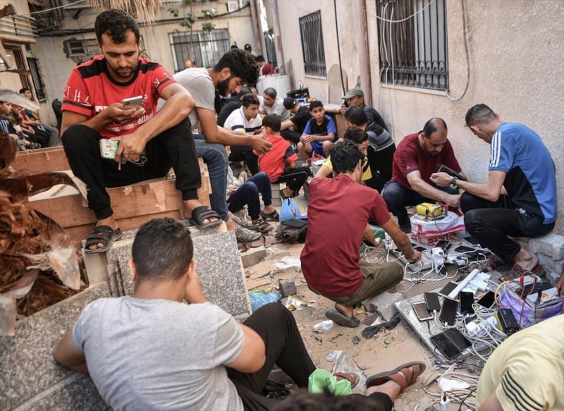 İsrail ablukasında elektriği kesilen Gazze'de insanlar, dünya ile iletişimini devam ettirmek için cep telefonlarını Filistin Kızılayı binasına gelerek şarj ediyor.