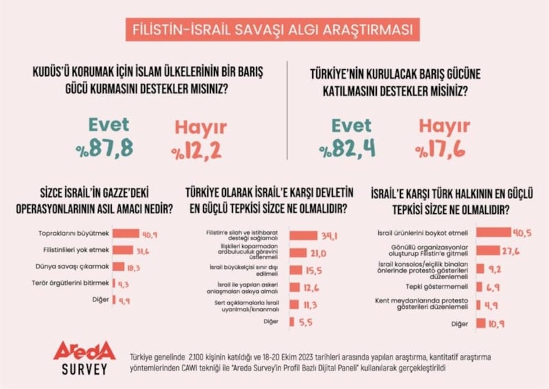 İsrail'in Filistin'i işgalini ve katliamlarını durdurmak amacıyla İslam ülkelerinin askeri güç oluşturmasına Türk halkından büyük oranda destek geldi. Yapılan ankette katılımcıların yüzde 82,4'ü, Türk ordusunun da olduğu barış gücü oluşturulmasını istiyor.