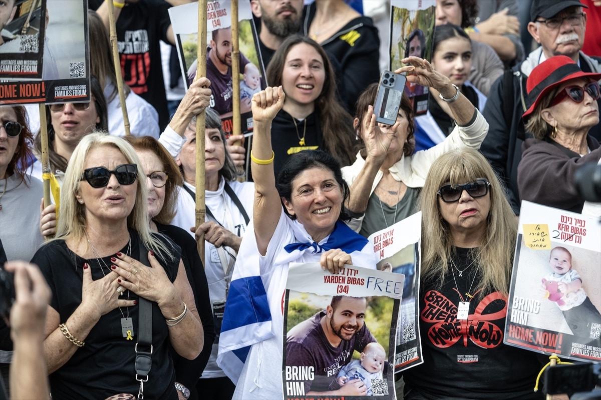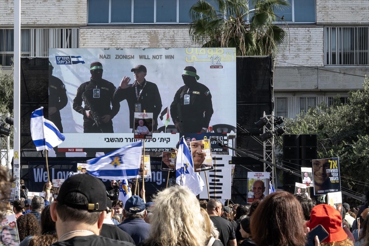 İsrail'in Tel Aviv kentindeki Rehine Meydanı'nda toplanan İsrailliler, Hamas ile İsrail arasında yapılan esir takasını dev ekranlardan izledi.