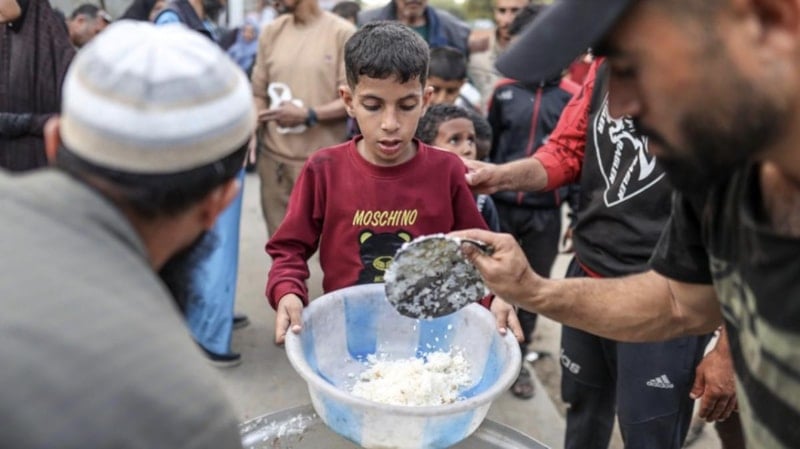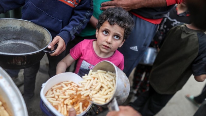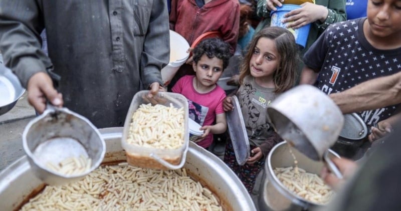 Küçücük bedenleriyle açlıkla mücadele eden Filistinli çocuklar, biraz yemek alabilmek için kendilerinden büyük yemek kazanının etrafında birbiriyle yarışıyor.