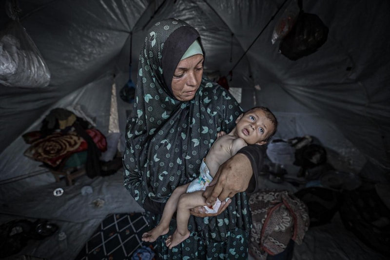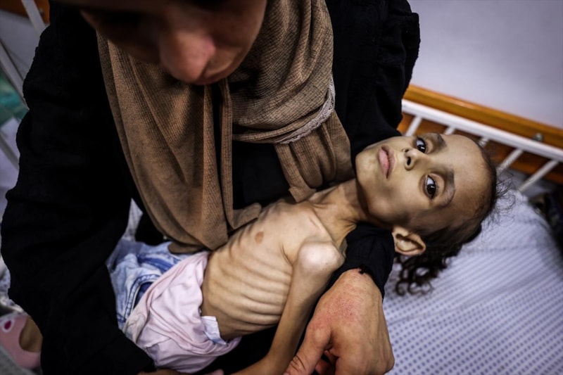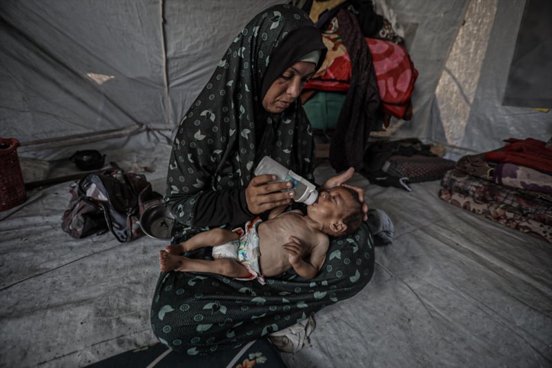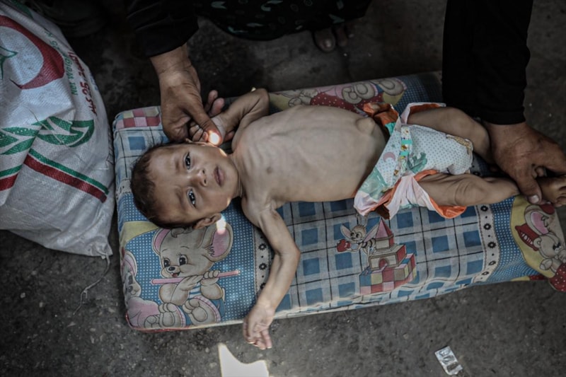 Açlık ve yetersiz beslenme ile mücadele eden binlerce çocuktan biri olan 7 aylık Hasan Ahmed Felfel, Gazze'deki Abdulaziz er-Rantisi Çocuk Hastanesi’nde kısıtlı imkânlarla tedavi görüyor.