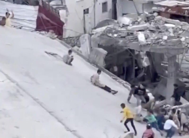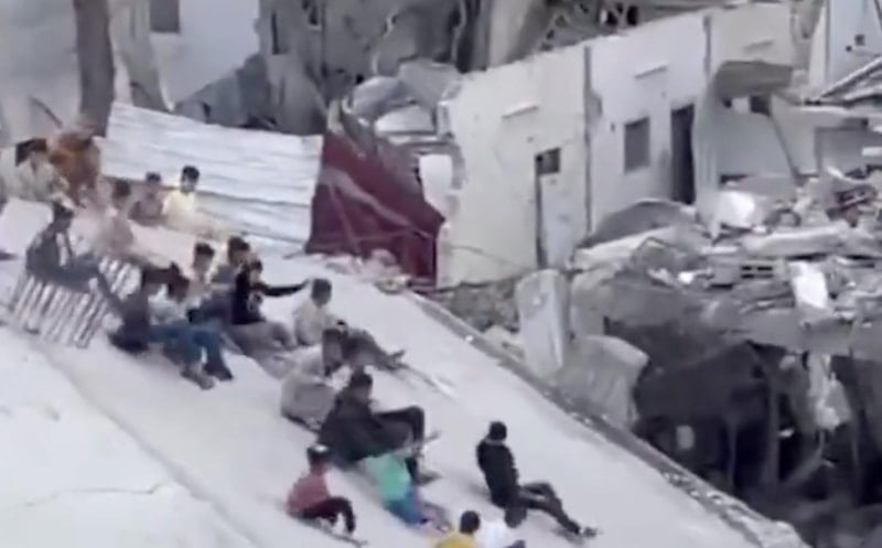 6 aydır İsrail ordusunun zulmüne uğrayan Gazze halkı, bayramı saldırılar altına geçirirken, çocuklar yıkılan evlerin üzerinden kayarak oyun oynadı.