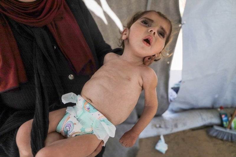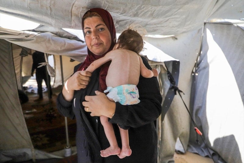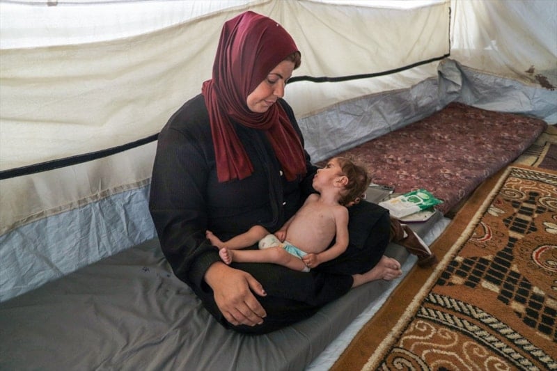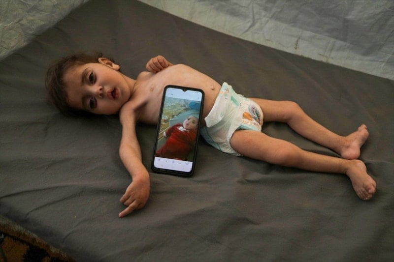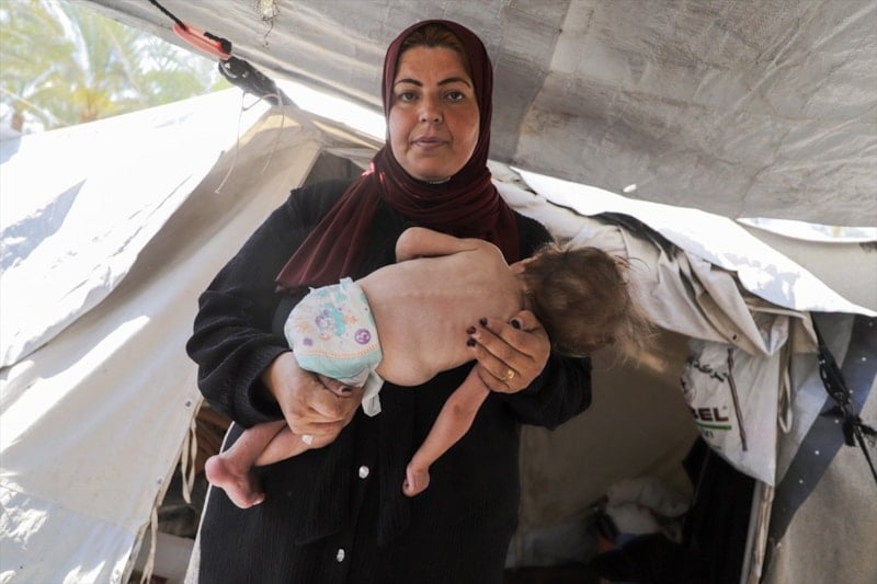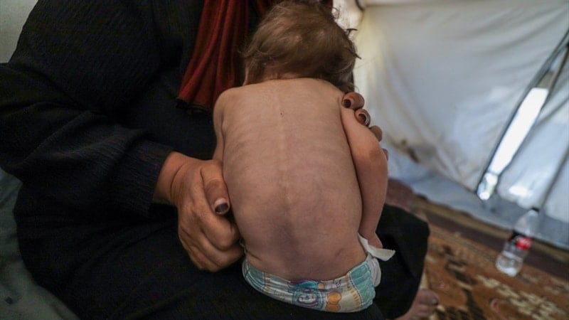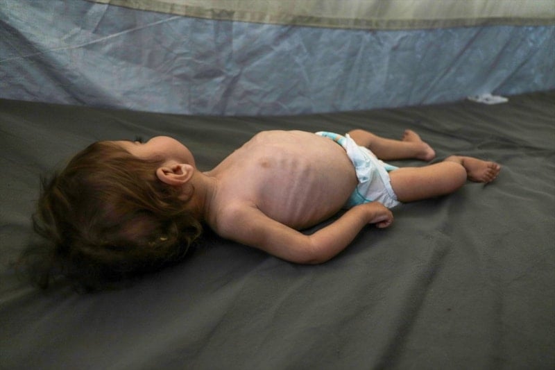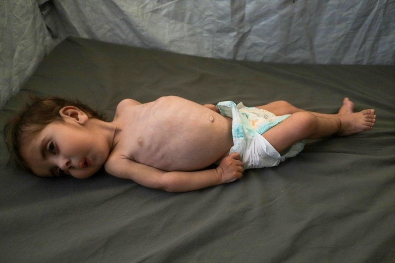Gazze Şeridi’nin orta kesimindeki Zevayide bölgesinde derme çatma bir çadırda ailesiyle yaşayan 1,5 yaşındaki Filistinli Rital Raid Haniyye, gıda ve tıbbi tedaviye erişimdeki yetersizlik nedeniyle şiddetli yetersiz beslenme sorunu yaşıyor.