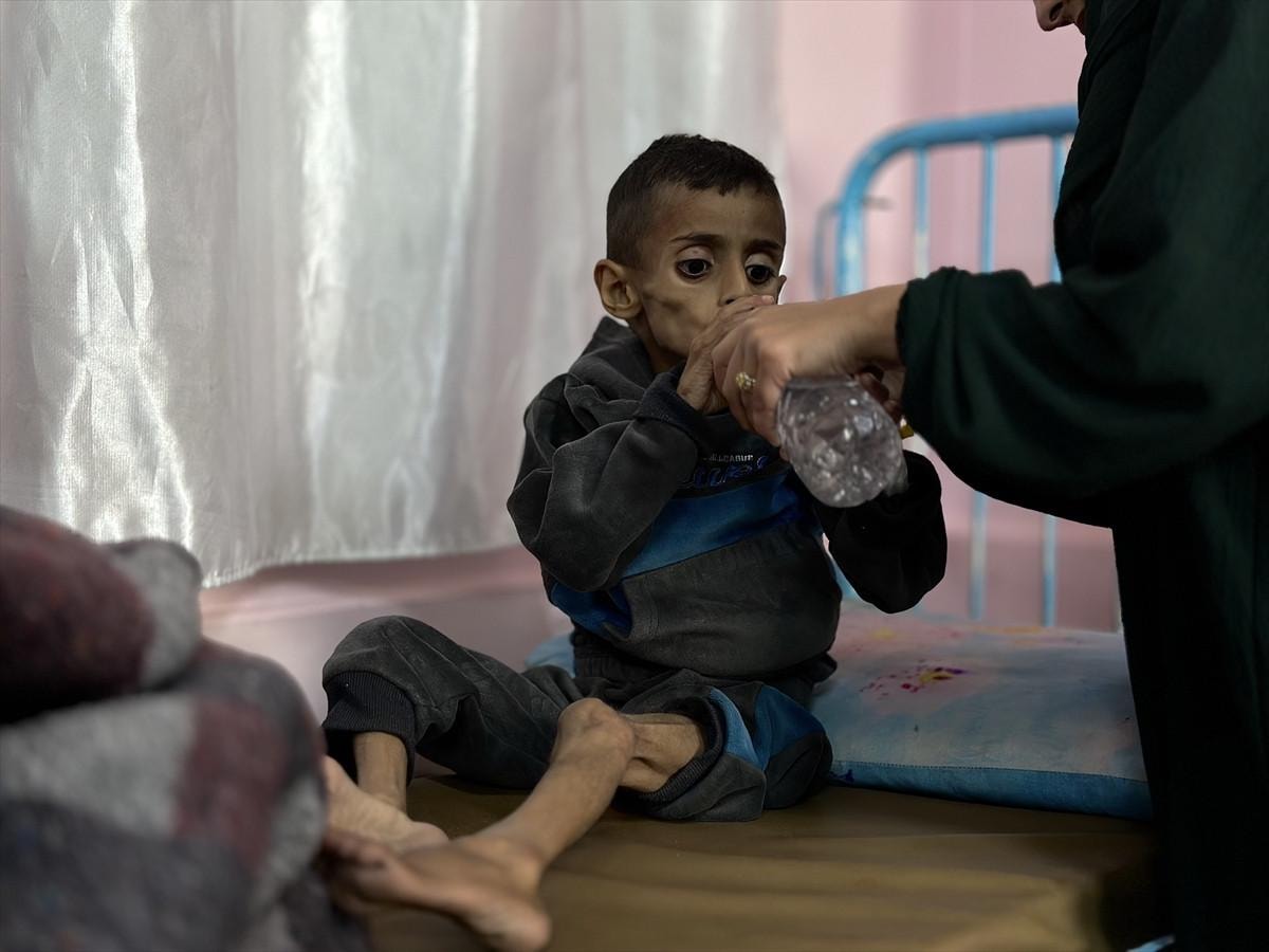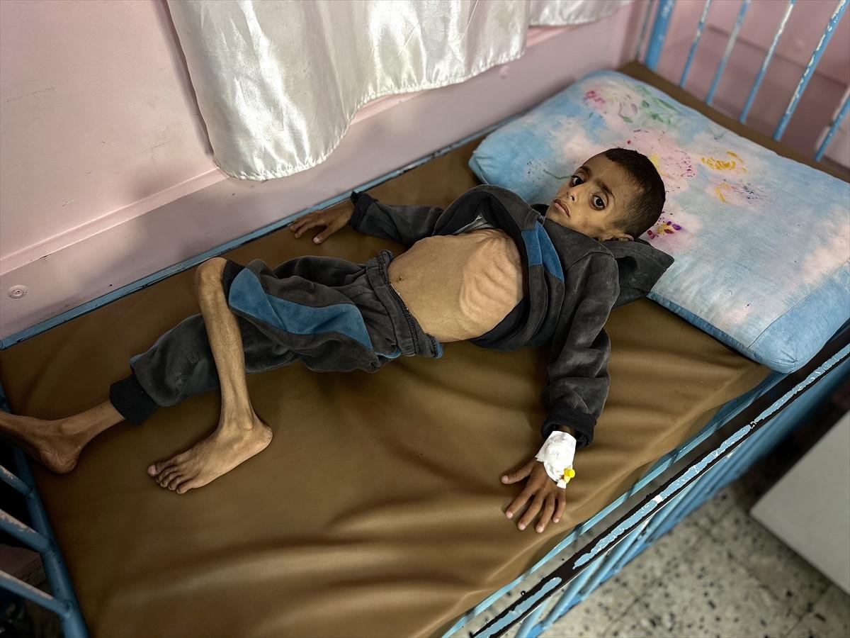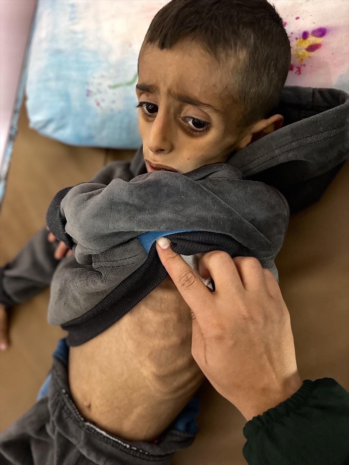 Osama El Rakab adlı Filistinli çocuk, yetersiz beslenmeye bağlı vücut zayıflığı sorunlarıyla Gazze kentinin güneyinde yer alan Han Yunus kentindeki Nasır Hastanesi'nde yaşam mücadelesi veriyor.
