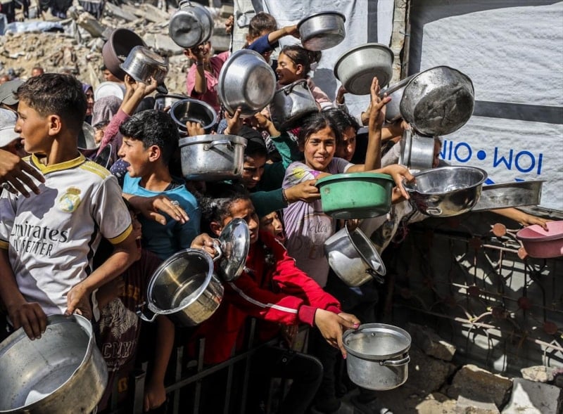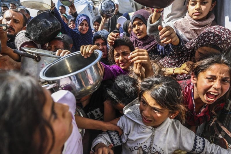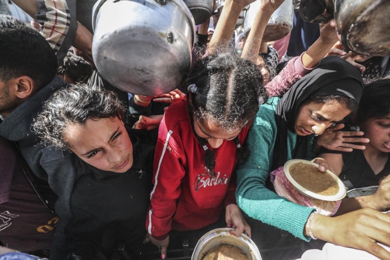 Bazı hayır kurumları, Gazze'nin kuzeyindeki Cibaliya Mülteci Kampı'ndaki Filistinlilere yemek dağıttı. Yiyecek bulmakta zorluk çeken Filistinliler, dağıtılan yemeklerden alabilmek için yoğunluk oluşturdu.