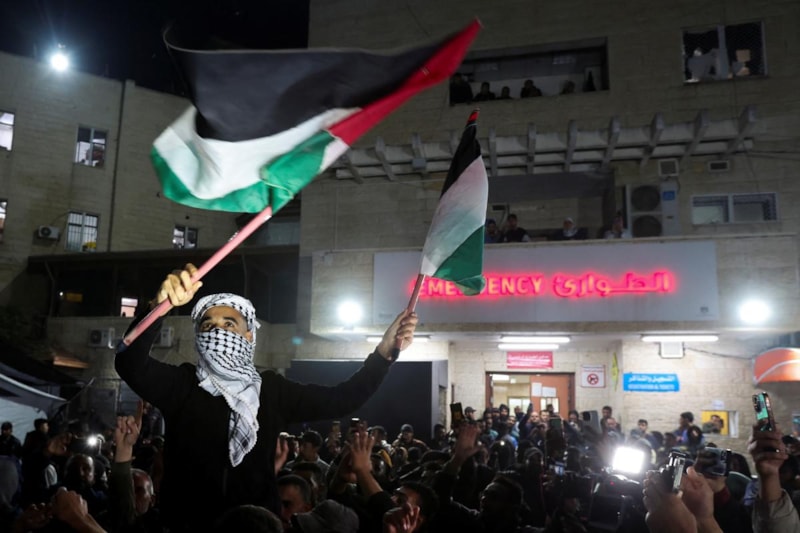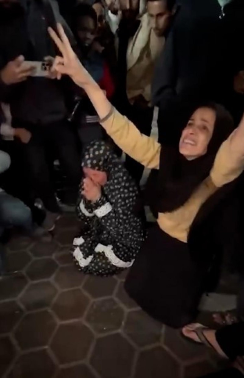 Filistinlilerin toplandığı, Gazze'deki Aksa Şehitleri Hastanesi bahçesinde sevinç gözyaşları vardı.