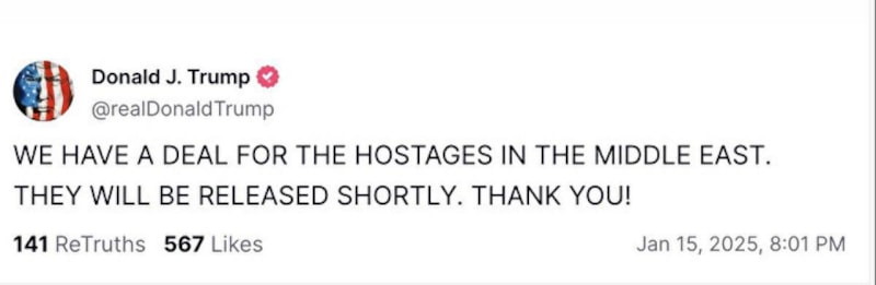 ABD'nin seçilmiş başkanı Donald Trump, İsrail ve Hamas arasında anlaşma sağlandığını duyurdu: