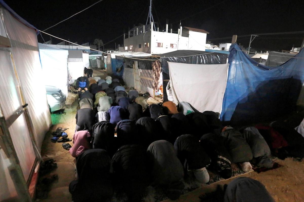 Gazze Şeridi'nin merkezindeki Maghazi Mülteci Kampı’nda yaşayan yüzlerce Filistinli, İsrail’in bombardımanı altında ilk teravih namazını dar sokaklarda kıldı.