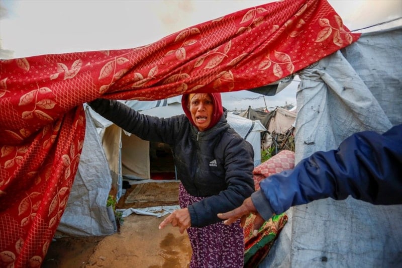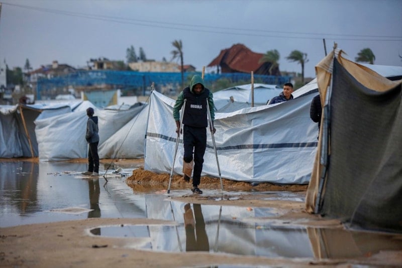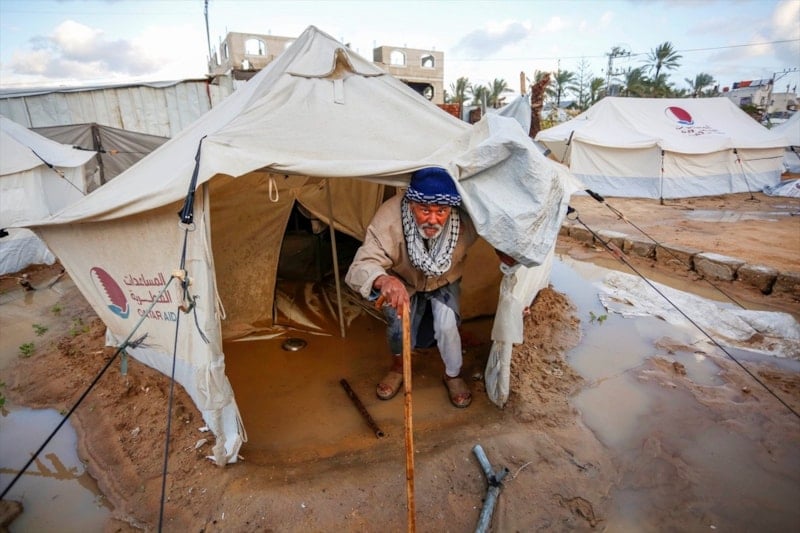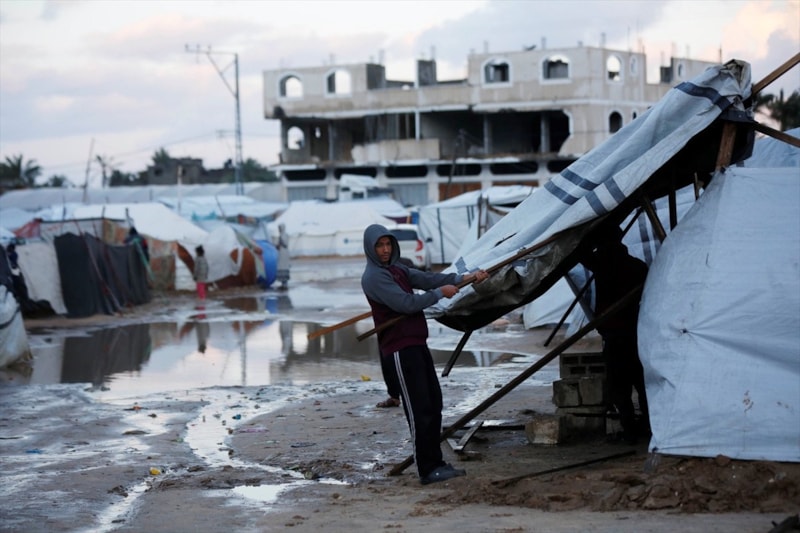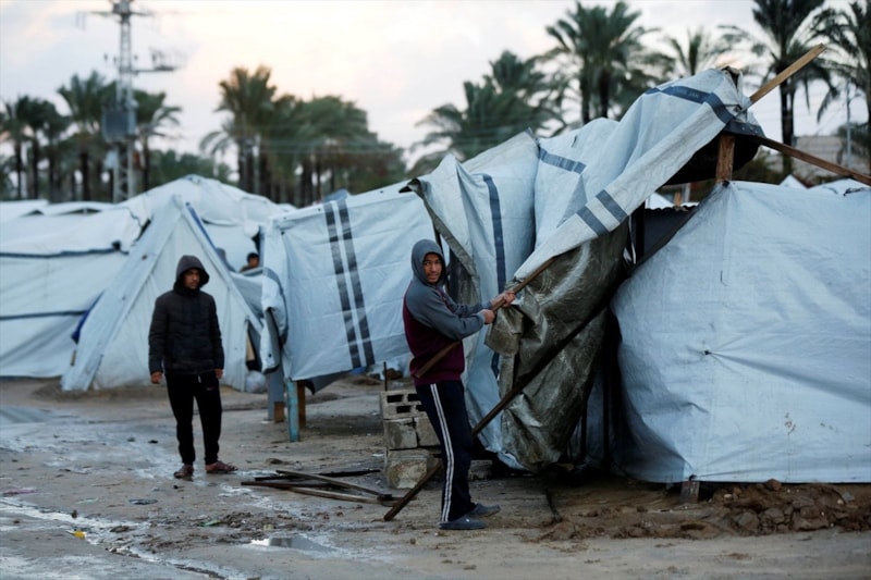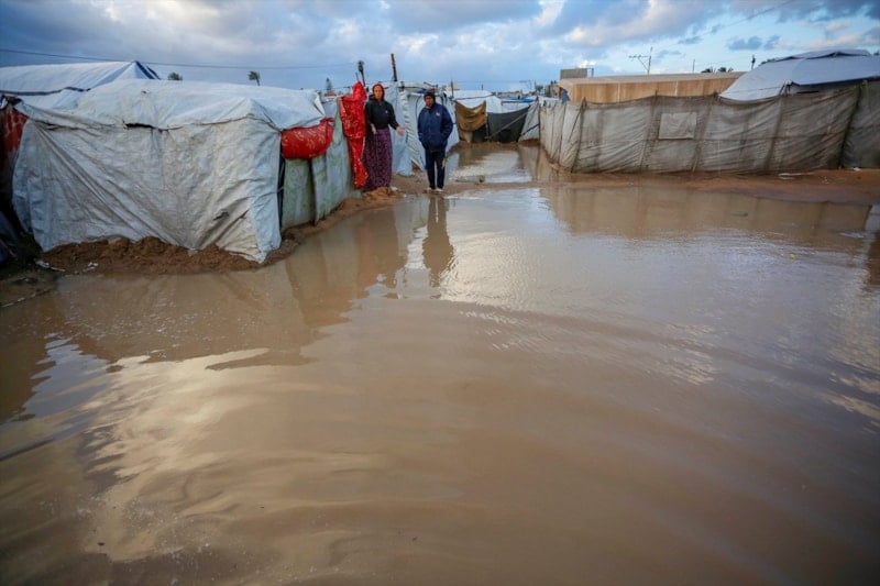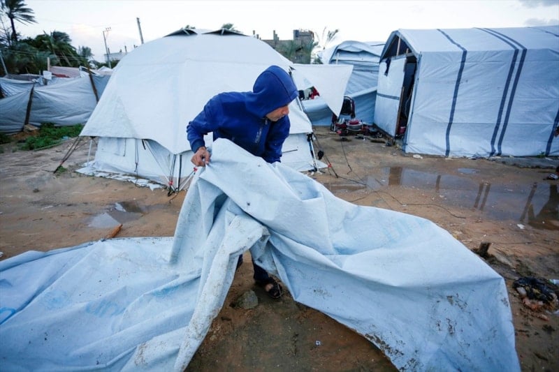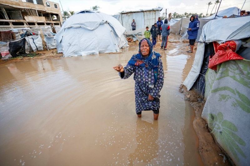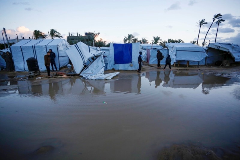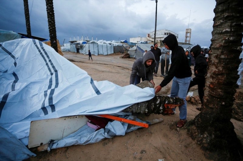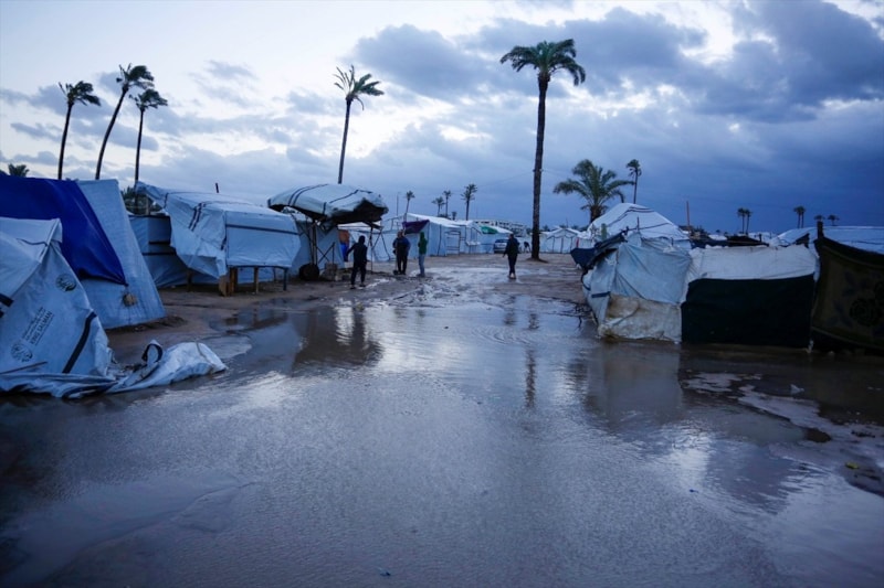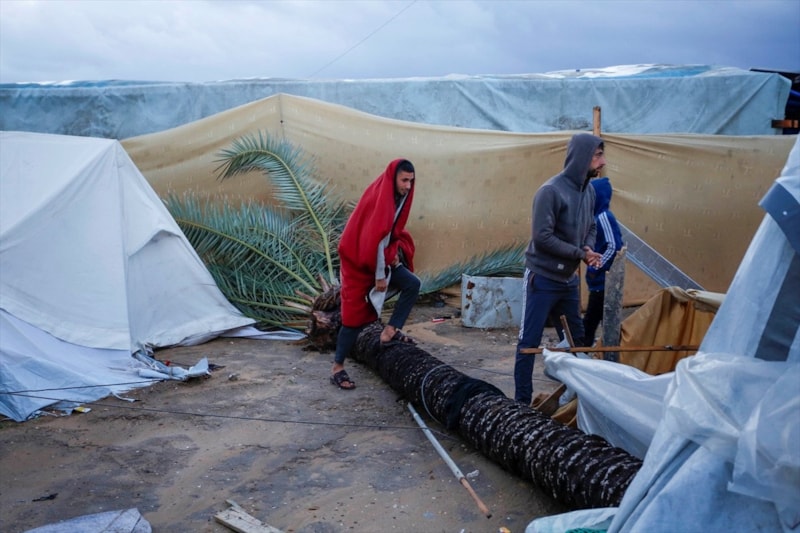 Gazze'de etkili olan şiddetli yağmur ve rüzgar, çok sayıda çadırın sular altında kalmasına, bazı çadırların uçmasına ve hurma ağaçlarının çadırların üzerine devrilmesine yol açtı.