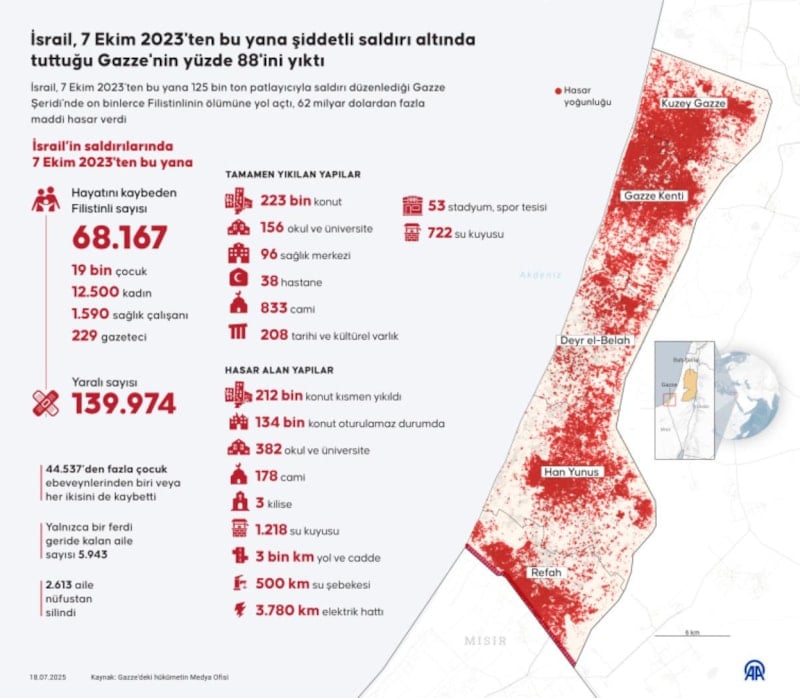 İsrail, 7 Ekim 2023'ten bu yana 125 bin ton patlayıcıyla saldırı düzenlediği Gazze Şeridi'nde on binlerce Filistinlinin ölümüne yol açtı, Gazze'nin yüzde 88'ini yıkıma uğrattı ve 62 milyar dolardan fazla maddi hasar verdi.