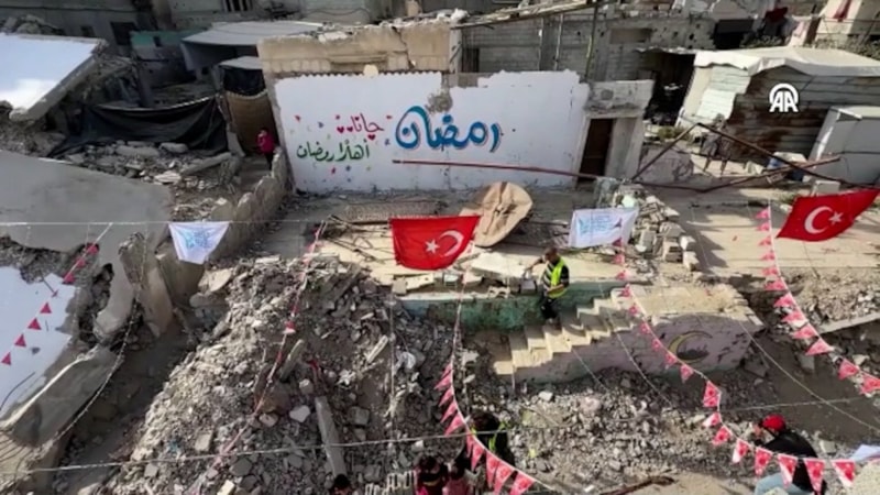 İsrail’in saldırılarında ağır hasar gören Gazze Şeridi’nin güneyindeki Han Yunus kentinde yıkımın izlerinin sürdüğü bir mahalle, Ramazan ayı öncesinde Türk bayraklarıyla süslendi.