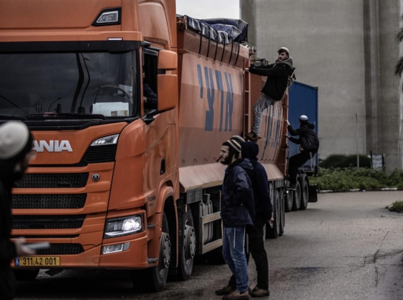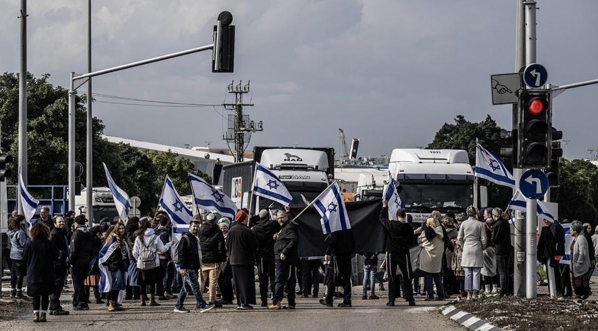 Gazze Şeridi yakınlarındaki Usdud Limanı çıkışında toplanan yerleşimciler, İsrail polisinin gözetiminde, buradan ayrılan tırları durdurup, evraklarını isteyerek ne taşıdıklarını ve nereye gittiklerini kontrol etti.