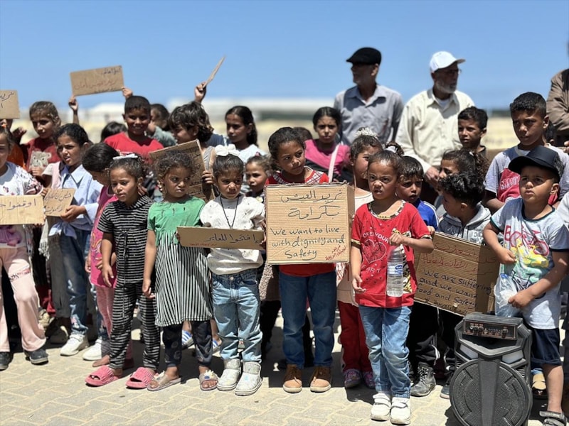 Gazzeli çocuklar, dünyaya açlıkla savaştıkları mesajını, enkaz yığınları arasında yaptıkları gösteriyle duyurdu. Çocuklar yaptıkları etkinlikte, 'Yeter, artık ölüm istemiyoruz' yazılı pankartlar taşıdı.