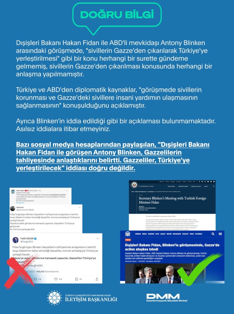 İletişim Başkanlığı Dezenformasyonla Mücadele Merkezi, "Dışişleri Bakanı Hakan Fidan ile görüşen Antony Blinken, Gazzelilerin tahliyesinde anlaştıklarını belirtti. Gazzeliler Türkiye'ye yerleştirilecek" iddiasının doğru olmadığını bildirdi.
