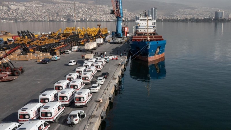 İzmir Alsancak Limanı'na dün gece demirleyen kuru yük gemisine, görevlilerce tıbbi malzemeler ve ambulanslar yüklendi.