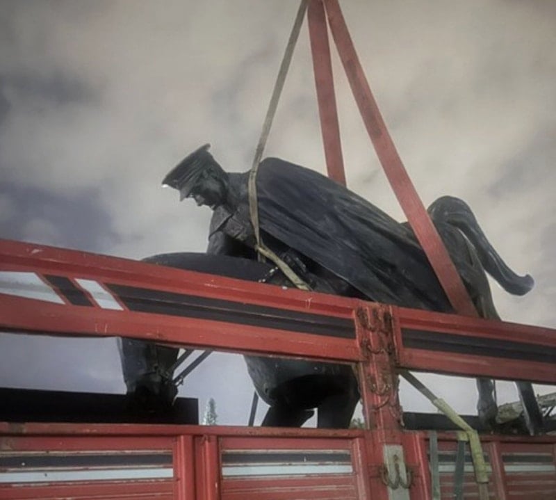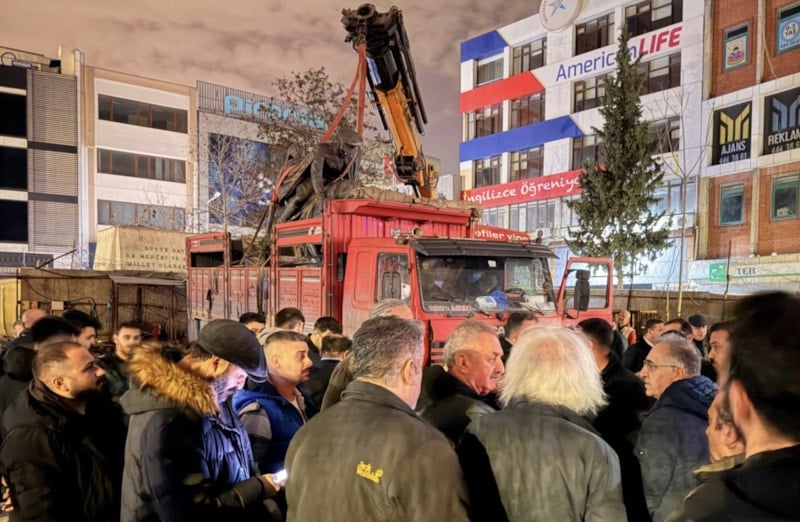 Vinçlerle anıtın kaldırılıp kamyonlara yüklendiğini gören CHP'li yönetici ve partililer, hemen meydana akın etti.