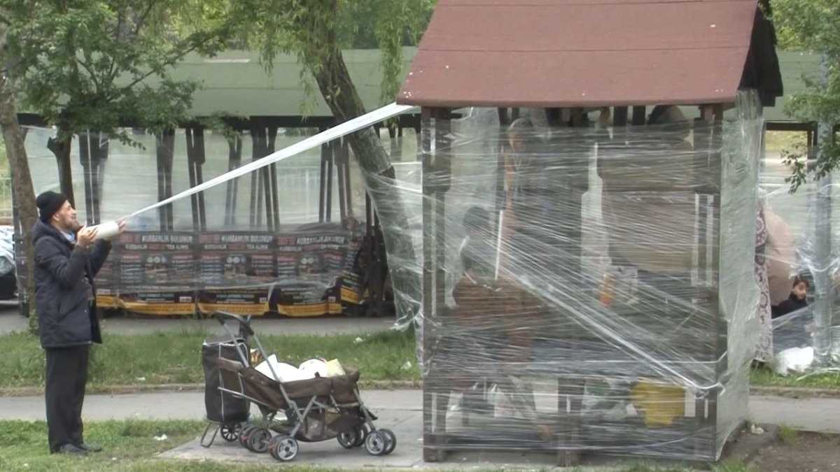 Bankların ve ağaçların çevresi streç filmle kaplanarak, rüzgarın etkisi azaltılmaya çalışıldı.