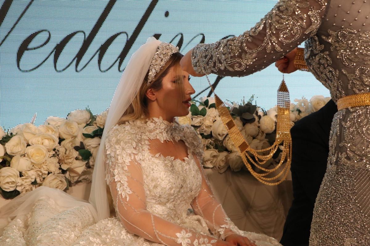 Korumalar eşliğinde sahneye getirilen bir valiz dolusu 8 kilogram ağırlığında bilezik, taç, kemer, gerdanlık, kolye gibi takılar takıldı.