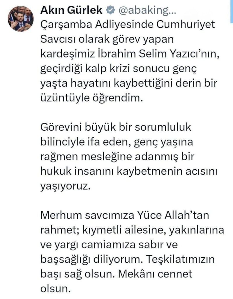 Adalet Bakanı Akın Gürlek, Samsun Çarşamba Adliyesi’nde Cumhuriyet Savcısı olarak görev yapan 28 yaşındaki İbrahim Selim Yazıcı’nın geçirdiği kalp krizi sonucu yaşamını yitirdiğini açıkladı.