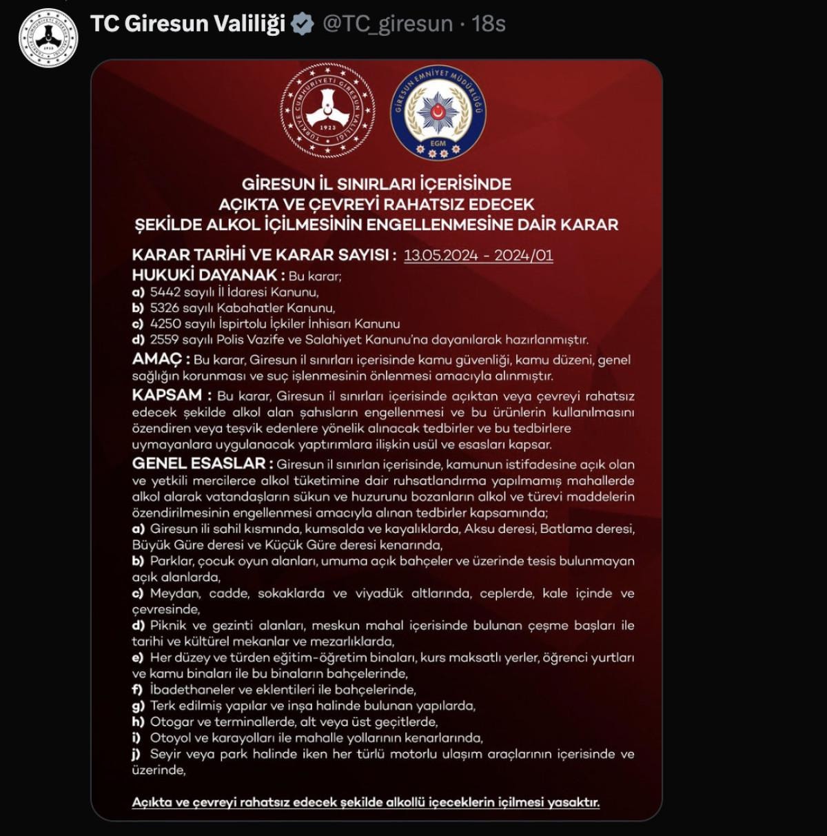 "Giresun il sınırları içerisinde açıkta ve çevreyi rahatsız edecek şekilde alkol içilmesinin engellenmesine dair karar karar tarihi ve karar sayısı: 13.05.2024 - 2024/01