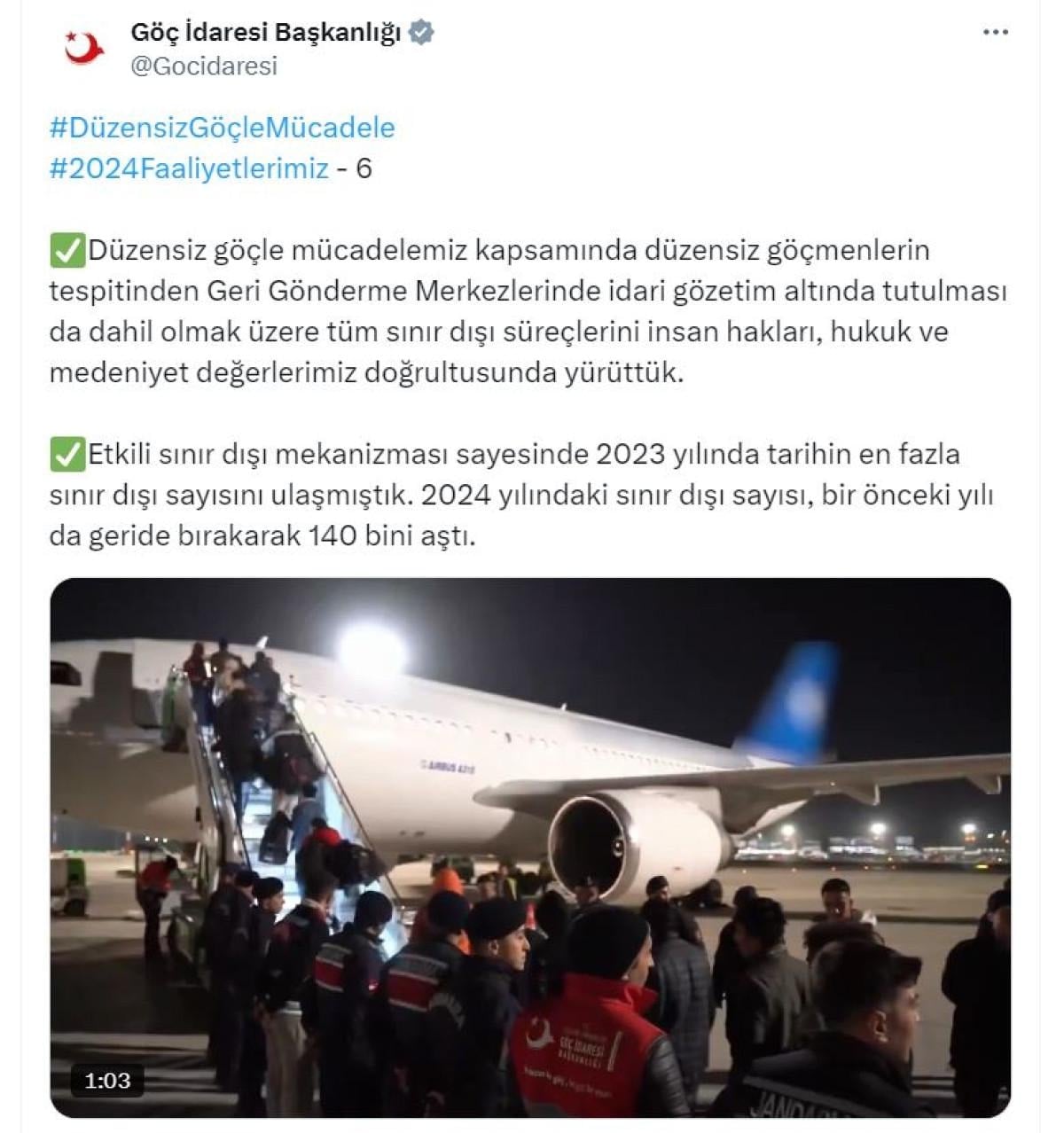 Düzensiz göçle mücadelemiz kapsamında düzensiz göçmenlerin tespitinden Geri Gönderme Merkezlerinde idari gözetim altında tutulması da dahil olmak üzere tüm sınır dışı süreçlerini insan hakları, hukuk ve medeniyet değerlerimiz doğrultusunda yürüttük. Etkili sınır dışı mekanizması sayesinde 2023 yılında tarihin en fazla sınır dışı sayısına ulaşmıştık. 2024 yılındaki sınır dışı sayısı, bir önceki yılı da geride bırakarak 140 bini aştı" ifadelerine yer verildi,