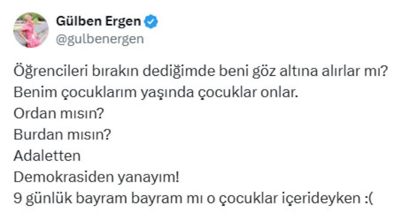 Gülben Ergen, küfredenlerin gözaltına alınmasını eleştirdi. Sosyal medyadan paylaşım yağan Ergen, "Öğrencileri bırakın dediğimde beni gözaltına alırlar mı? Benim çocuklarım yaşında çocuklar onlar.