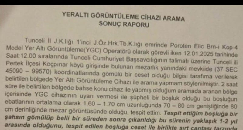 Tunceli İl Jandarma Komutanlığı bünyesinde görevli bir Yeraltı Görüntüleme Cihazı (YGC) operatörü tarafından hazırlanan "Yeraltı Görüntüleme Cihazı Arama Sonuç Raporu" ortaya çıktı.