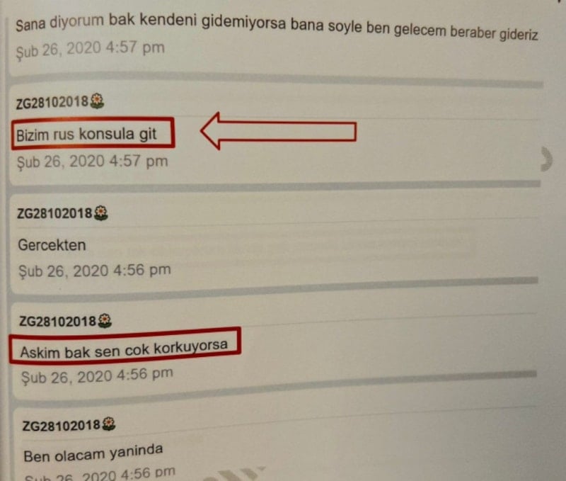 Mesaj içeriklerinde geçen; “Seni ONLAR’ın elinden kurtarırım”, “Rus konsolosluğa git, seni korurlar”, “Devlete bildirmezler, korkma” gibi ifadelerle belirli bir yetkili makamı kastettiğine dair ima ve vurgular yaptığı görüldü.